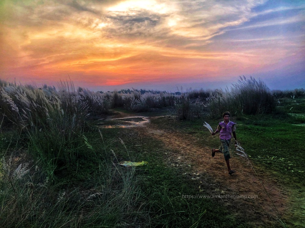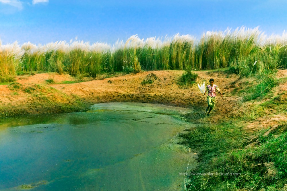 It was almost late afternoon, we came back to Habitapur playground. Rural kids were playing football – the innocent dreams to be Mesi, Ronaldo. Their coach was wearing the jersey of Pep guardiola. Leaving aside, we entered into the small jungle of Saccharum (In Bengali – Kashbon). We found two young kids playing. One of them reminds me of “Apu” – The main character of the novel and its eponymous film “Pather Panchali”.