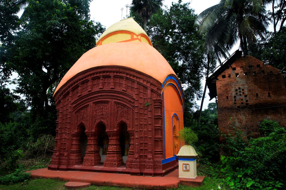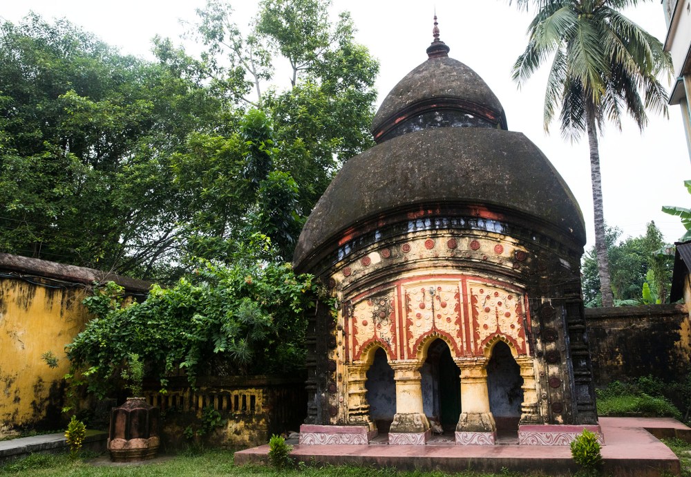 A five-minute drive from the Amta-Jhikhira Road, we landed in front of the Dadhimadhav Temple, a protected heritage monument under State Archaeology of the Government of West Bengal. According to the foundation stone, the temple was built by the Roy family in 1686 Shakabda (1764 according to Gregorian calendar). The south-facing twenty-five feet high temple is placed on a slightly higher pedestal. The temple follows atchala (eight roofed) style with porch on triple entrance. The panels depict the exquisite craftsmanship of the then artisans who built this temple.
