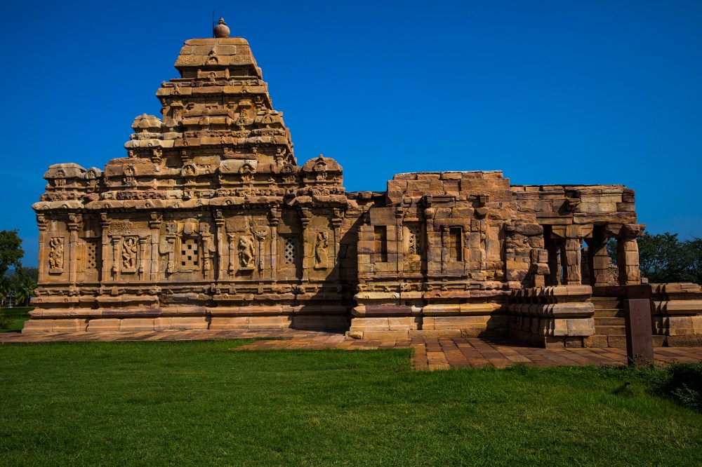 First we visited the Papanatha Temple. Dating back to the very end of the Chalukya Era, this temple is located around 300 metres from the temple complex. Architecturally the temple is an extraordinary mix of Nagara and Dravidian style. Erected on a platform, the temple consists of a pair of mandapa. I had never seen this type of paired mandapa.In bothe the pairs, the outer wall is decorated by triangular gavaksha pediments. The porches of the three sides contain perforated windows. The stories of Ramayana are depicted on the panels.