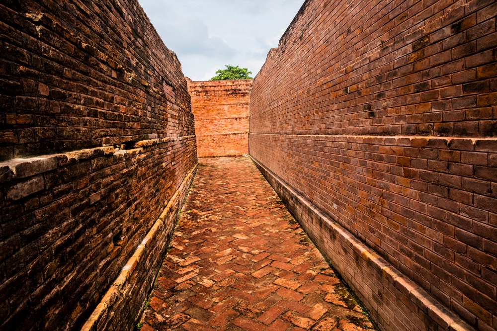 The structure was built on brick and terracotta. The stair merges to a brick path. Following the path, we went inside. It is a narrow passage flanked by a brick wall. In the passageway, the bricks are diagonally arranged.