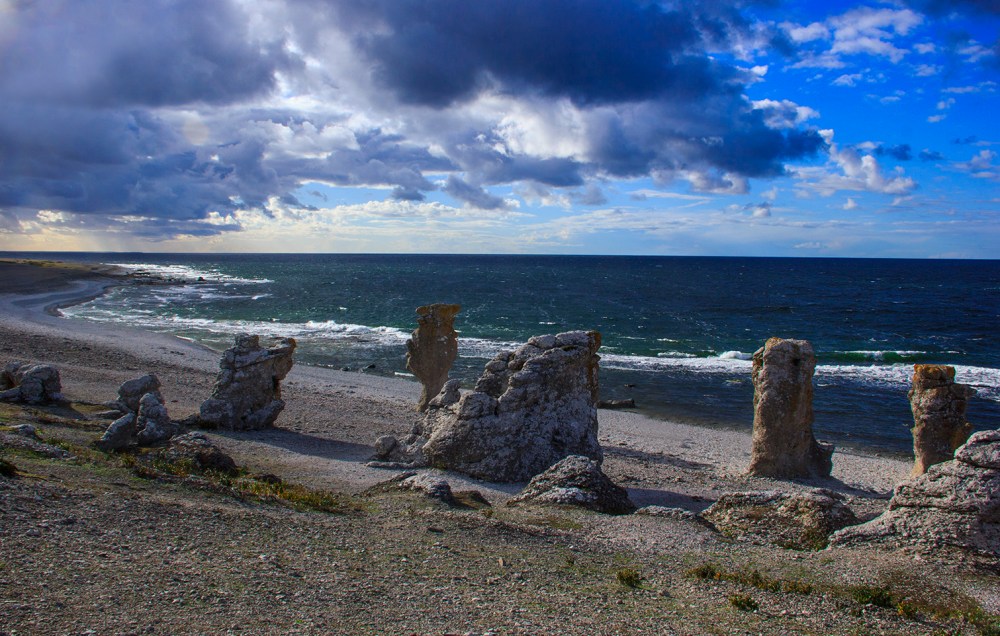 Langamaras beach of Fårö is world famous for its salt stacks. During the last ice age, sandstone accumulation has created various natural sculptures there. Colloquially the shapes are known as ‘Raukus’. The entire beach is rocky.