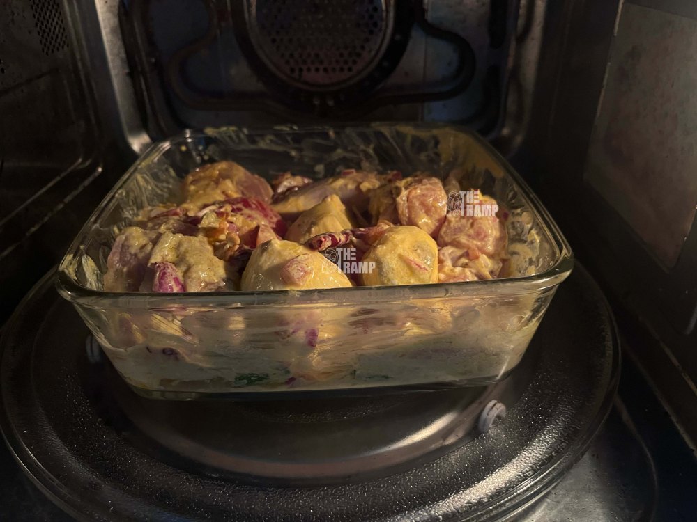 Take a fork and gently check whether the chicken and potatoes are properly cooked. If they are still a little firm, simply microwave for another 10 minutes.